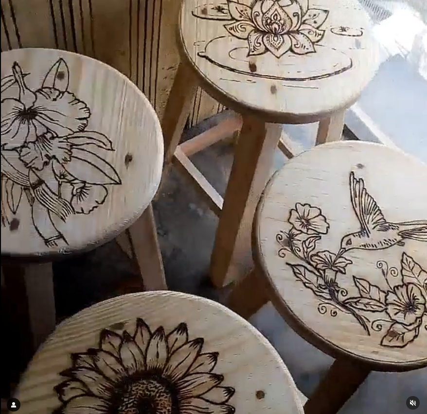 Transforme qualquer ambiente com a beleza única do artesanato local! Nossos bancos são produzidos em madeira maciça e trazem desenhos gravados à mão com pirogravura, em estilos florais e naturais como beija-flores, girassóis, orquídeas e mandalas. Cada peça é única e carrega a identidade de quem a criou. Ideal para compor sua casa, loja ou espaço de convivência com personalidade e arte.